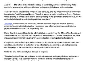 The Office of the Texas Secretary of State has formally notified Harris County officials of a complaint alleging improper voter registration practices…