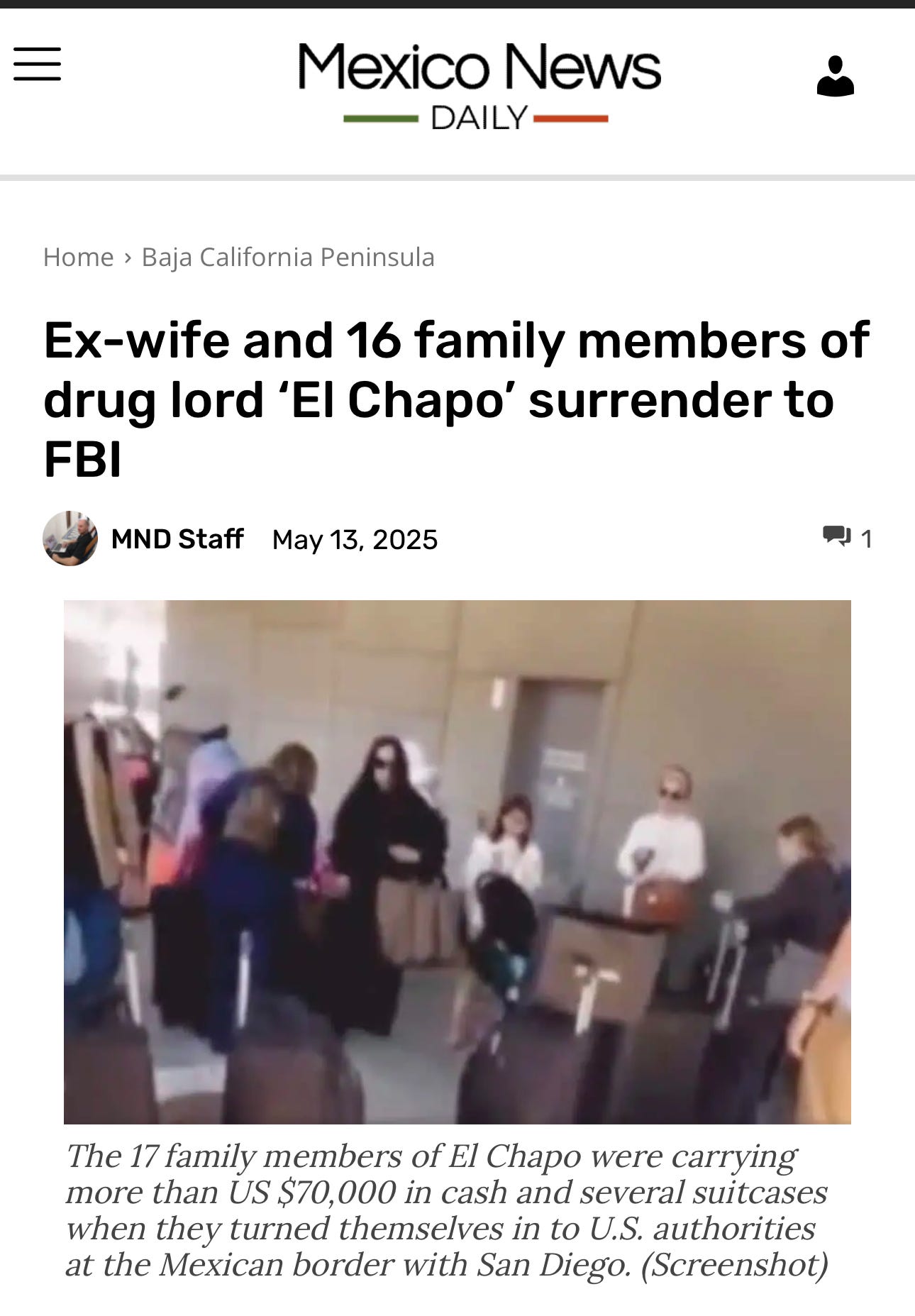 Seventeen relatives of Joaquín “El Chapo” Guzmán, the jailed Sinaloa Cartel kingpin, reportedly turned themselves over to U.S. authorities at the San Ysidro border crossing on May 9, 2025. The group, allegedly including Guzmán’s ex-wife Griselda López Pérez, a daughter, son-in-law, grandson Archivaldo, and assorted nephews and nieces, was met by FBI agents, per Mexican journalist Luis Chaparro. This mass surrender has ignited speculation about ties to plea deal talks involving Guzmán’s son, Ovidio Guzmán López, who faces U.S. drug trafficking charges.