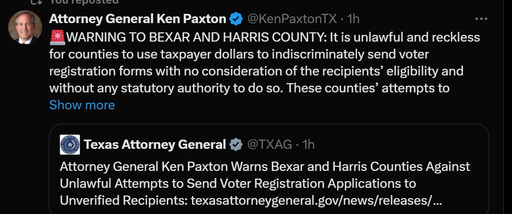 AG Ken Paxton Warns Bexar and Harris Counties Against Unlawful Attempts to Send Voter Registration Applications to Unverified Recipients