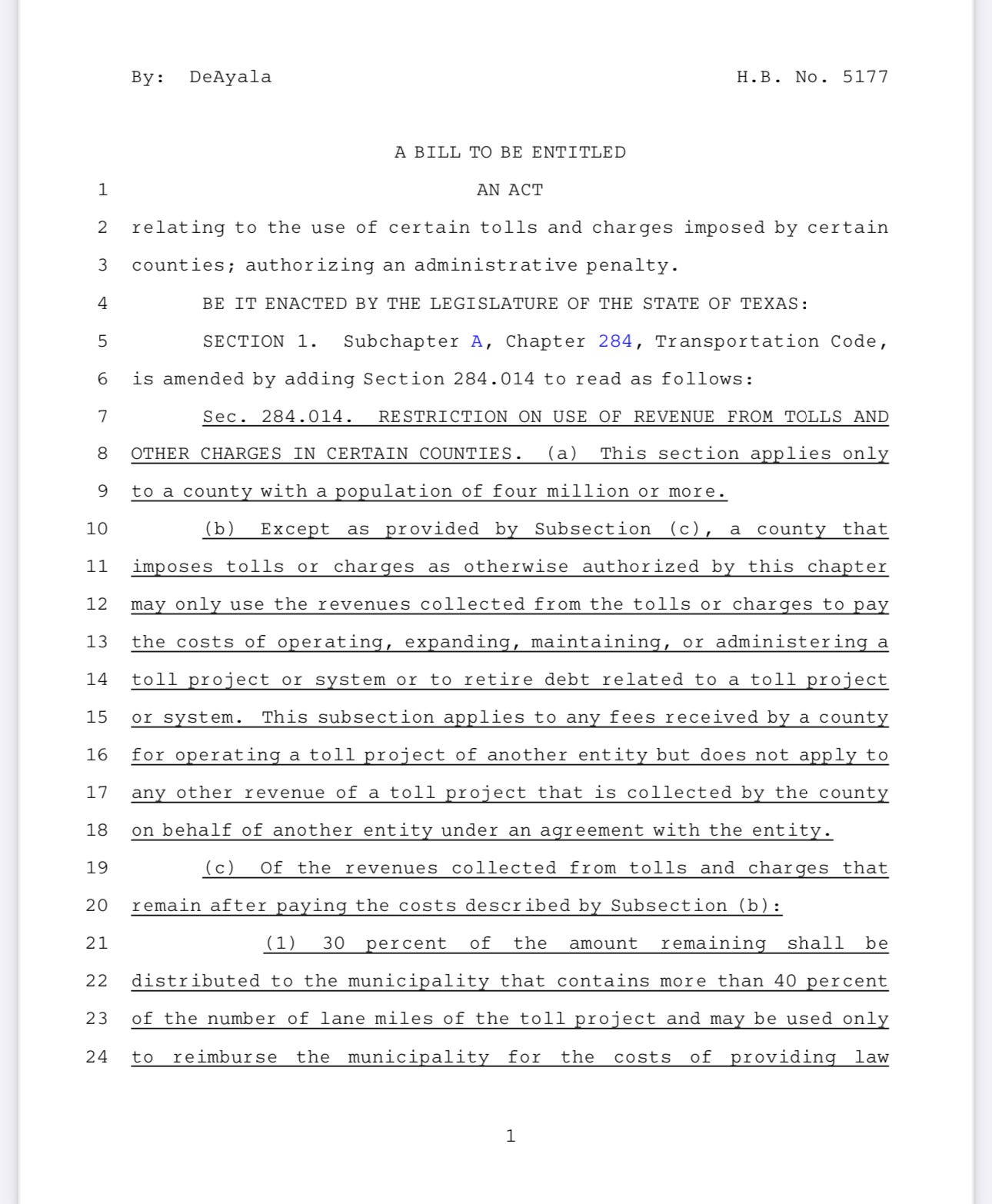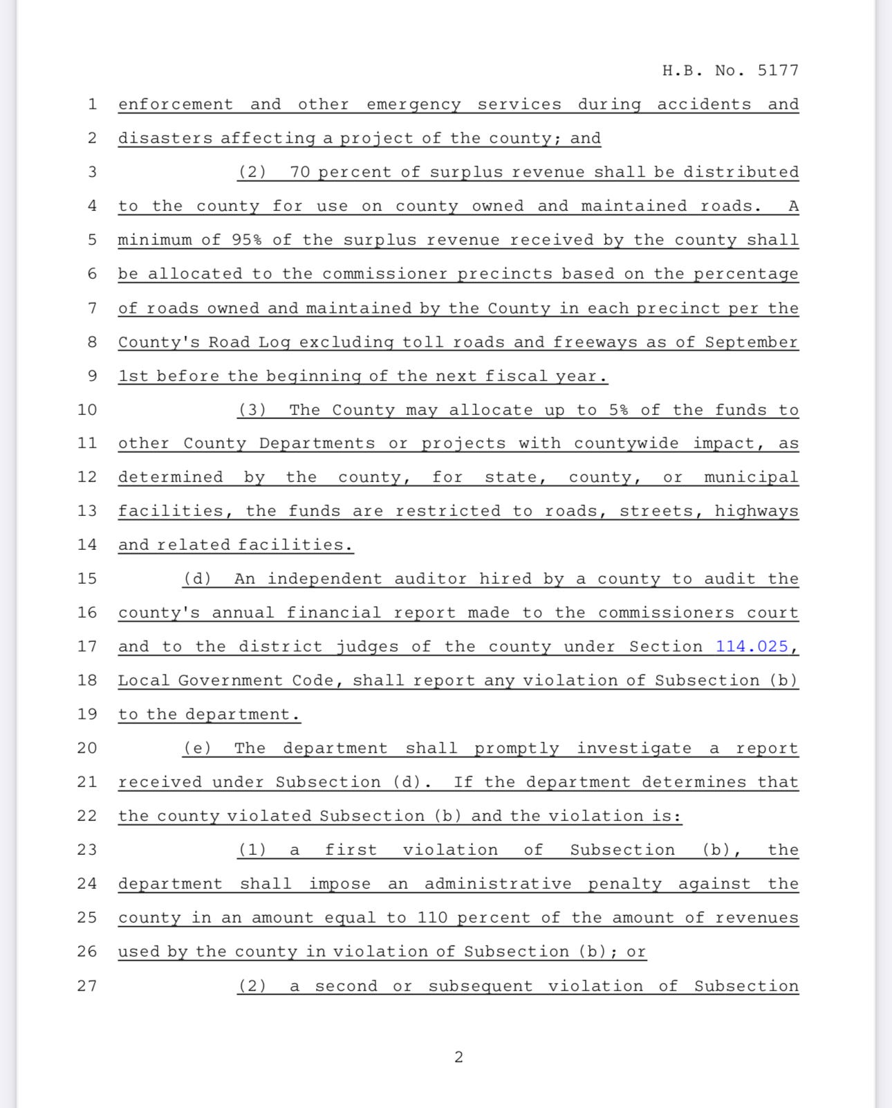 The bill stipulates that 30% of the surplus toll revenue would go to Houston to enhance support for police, fire, and emergency medical services services (EMS), addressing the demands placed on city responders who handle toll road incidents. The remaining 70% would stay with Harris County, earmarked solely for county road projects, ensuring continued upkeep and development of its transportation network.