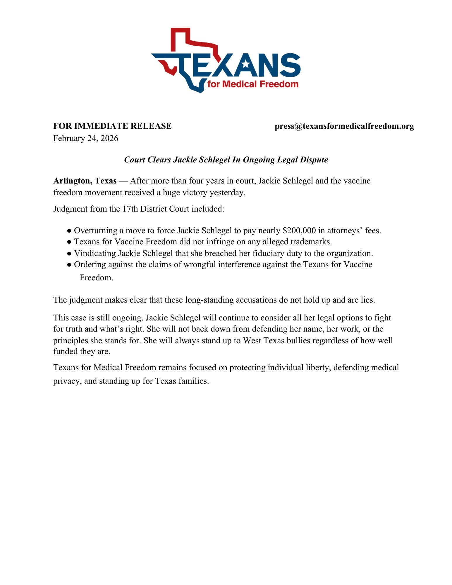 Hours after the ruling was signed, Schlegel’s current organization, Texans for Medical Freedom, issued a press release headlined “Court Clears Jackie Schlegel In Ongoing Legal Dispute.” The release described the outcome as a “huge victory” for Schlegel and the “vaccine freedom movement,” claiming the court overturned an attempt to force her to pay nearly $200,000 in additional attorney’s fees, ruled that Texans for Vaccine Freedom did not infringe trademarks, “vindicated” her on breach-of-fiduciary-duty claims, and rejected wrongful-interference allegations.