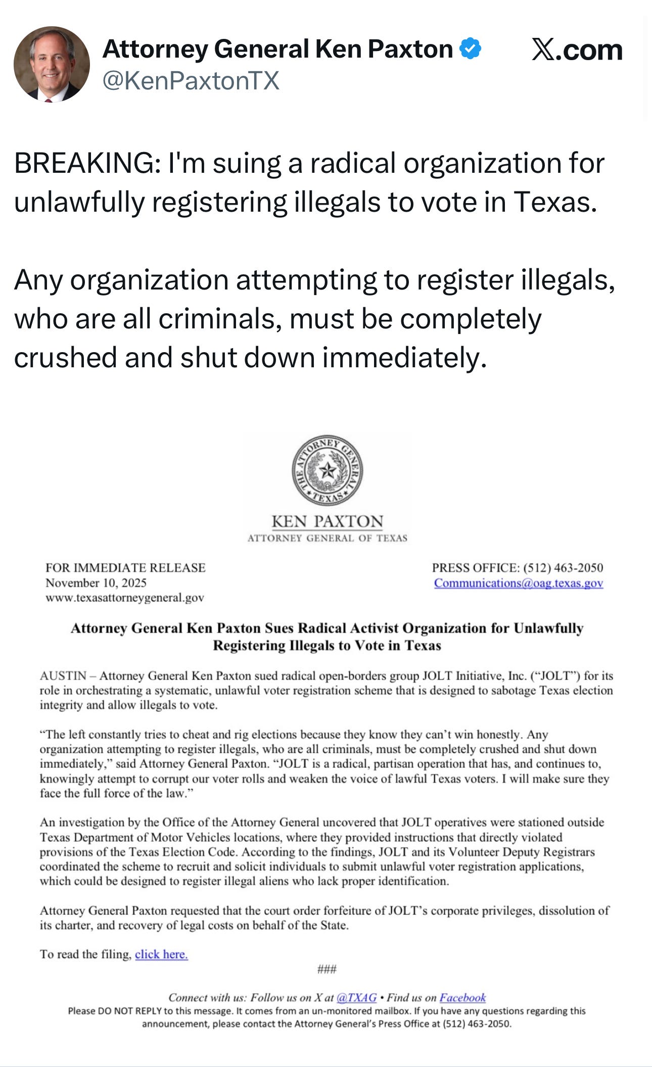 Paxton sued Jolt in state court, accusing the group of running a “systematic, unlawful voter registration scheme” that allegedly helps noncitizens register to vote. He claims Jolt volunteers, stationed outside DMV offices, instructed people on submitting applications in ways that violate Texas Election Code (e.g., helping register someone not physically present). Paxton calls Jolt a “radical, partisan operation” and seeks to dissolve its corporate charter, revoke its right to operate in Texas, and recover legal costs.