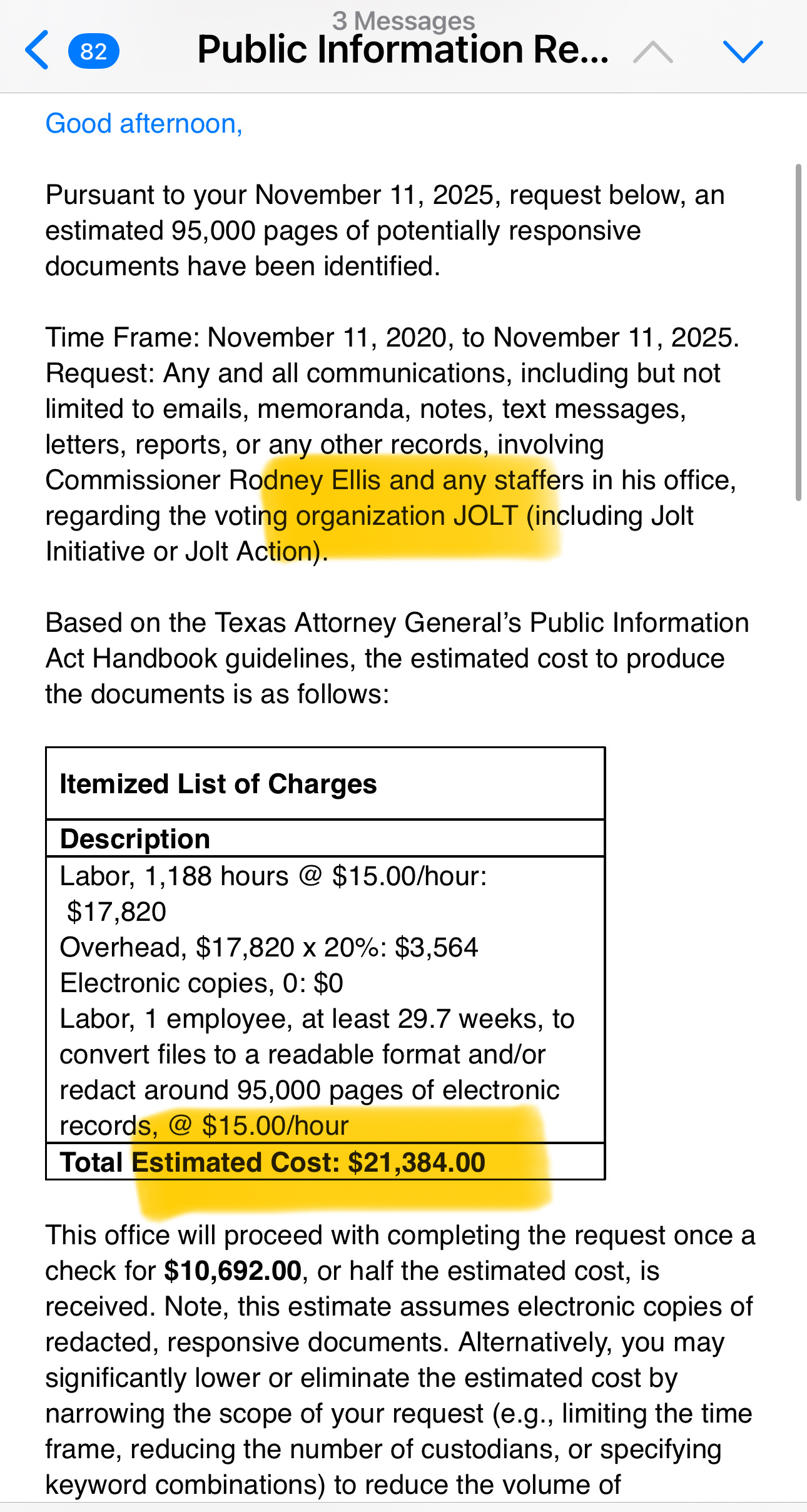 I filed a Texas Public Information Act request with Harris County Commissioner Rodney Ellis’s office for all communications between his staff and Jolt—the voter mobilization group currently under criminal investigation by Texas AG Ken Paxton.