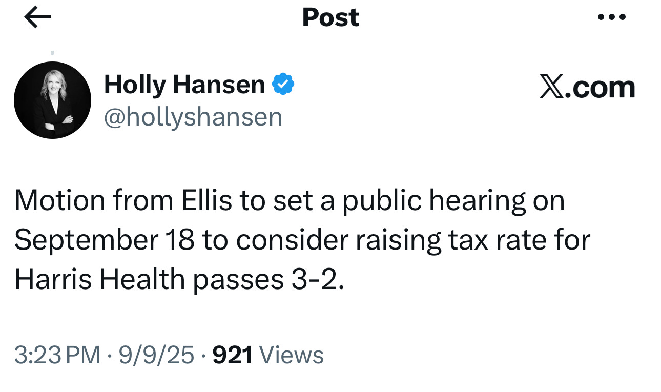 I want to see data from Harris health! What are they spending their money on? Social justice or patient care? Who is their patient population? Legal citizen residents or not. So much to be discussed with this tax hike!