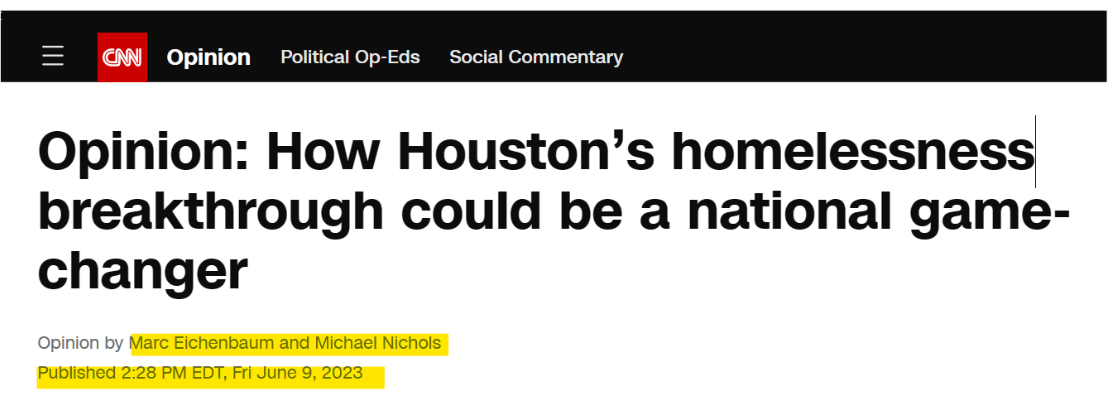 In the CNN Opinion piece Eichenbaum and Nichols regurgitate talking points written up over two years ago and continue to pretend that Houston’s homeless problem is not the worst it’s been since the 80s oil bust. In turn, these talking points are used to request more grants for the homeless. Unfortunately, this money seems to be finding its way predominantly to consultants, friendly real estate developers of City and county officials, and somehow continues to be shuffled around through various (hand selected?) charities which charge administrative fees each time they receive the funds.