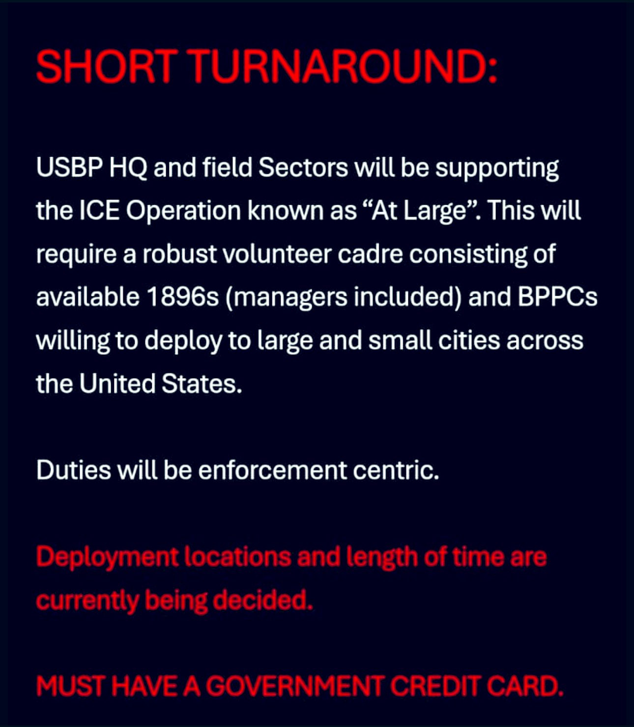 According to internal communications, USBP is seeking volunteers, including managers (1896s) and Border Patrol Processing Coordinators (BPPCs), to participate in this operation. The duties will be enforcement-centric, focusing on targeted apprehensions in coordination with ICE’s Enforcement and Removal Operations (ERO). While specific deployment locations and durations are still being finalized, volunteers should expect assignments in diverse urban and rural settings nationwide.