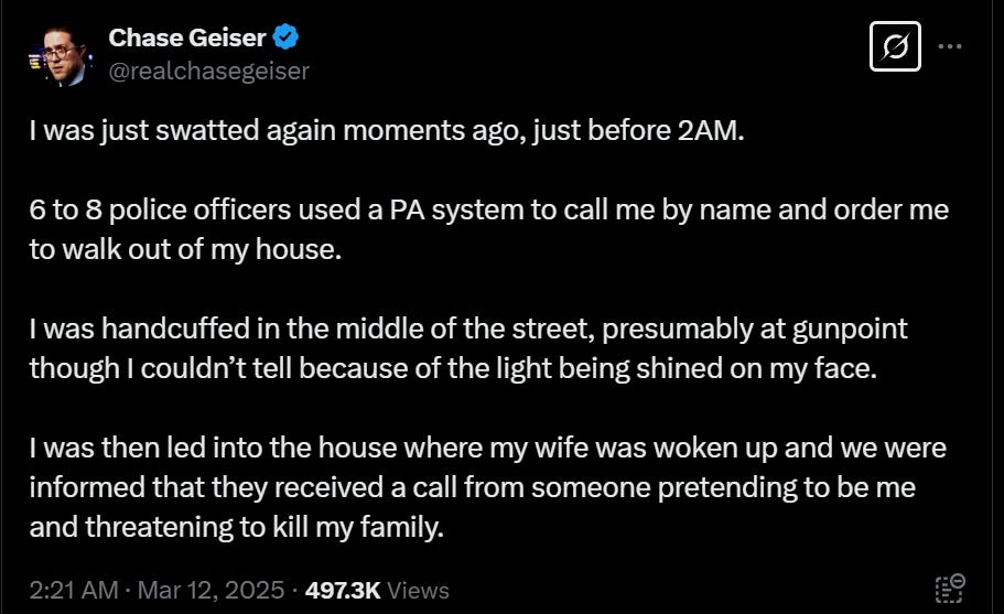 Last night, Infowars host Chase Geiser was swatted twice in his home. This is not the first time for a conservative to be swatted, nor will it be the last, though has become a common occurrence of harassment coming from the left. Swatting is a dangerous and illegal prank where someone makes a false emergency call, typically to law enforcement, claiming a serious threat—like a hostage situation, bomb threat, or active shooter—at a specific location. The goal is to provoke a large, armed police response, often a SWAT team, to the targeted address, which is usually that of an unsuspecting victim. While it may start as a misguided attempt at humor or revenge, swatting carries severe risks and consequences. The core issue is the mismatch between perception and reality: police treat the call as a genuine emergency, while the victim is blindsided. This disconnect creates a volatile situation where miscommunication or missteps can turn deadly. Advances in technology—like spoofed phone numbers or AI-generated voices—make swatting easier to execute and harder to trace, compounding the risks.