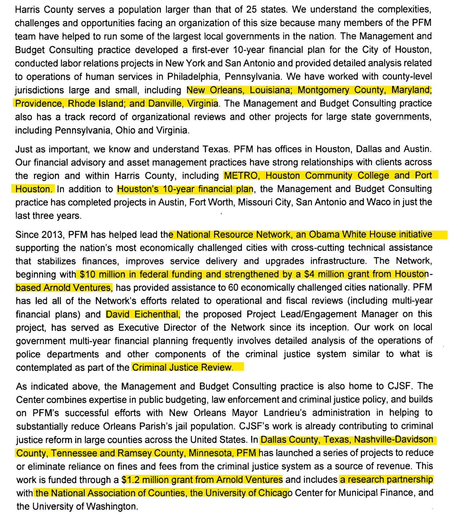 PFM Consulting Group is a far more nefarious entity than what I thought it was upon first look. This consulting group has infilitrated Harris County’s local government from top to bottom. PFM was welcomed in by the Democrats after they took control of our Commissioners Court in 2019. After digging through Commissioners Court video archives, I found that the first mention of PFM was by the DNC placeholder Lina Hidalgo on December of 2019. Though, it was Commissioner Rodney Ellis who was the one to bring forth the PFM contract in October 29th, 2019. PFM also has been integral in working with Houston METRO, Houston Community College, and The City of Houston in which they created the “10-year plan”.