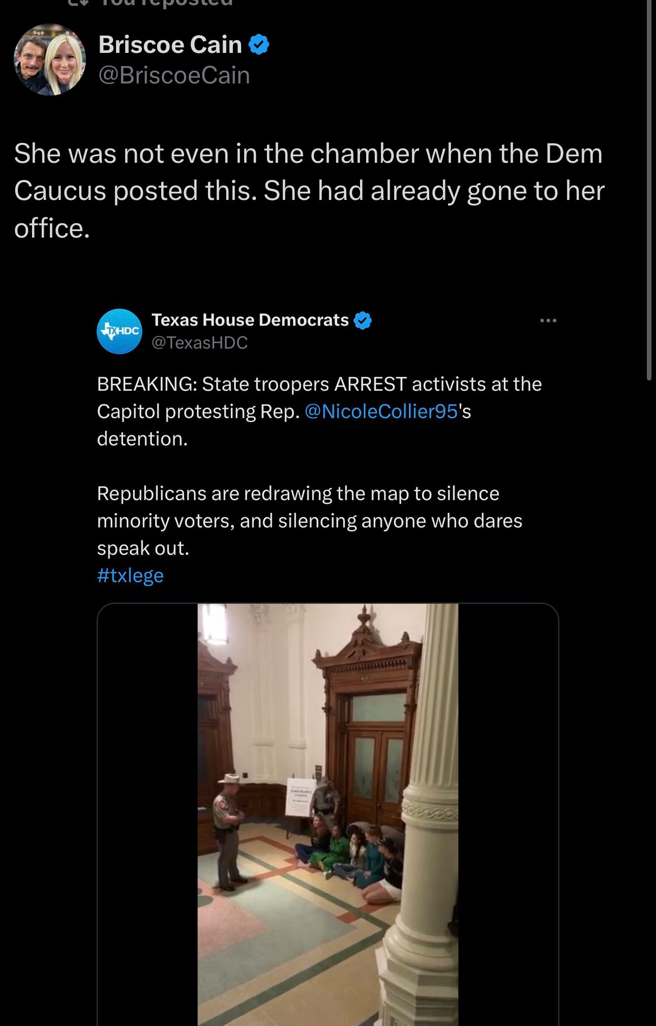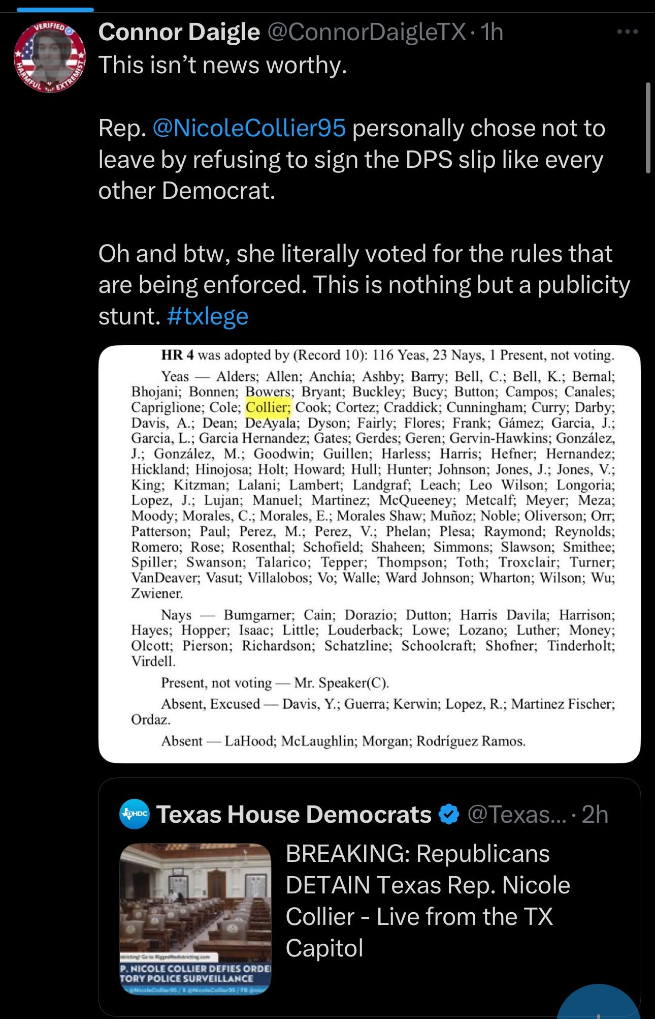 Connor Daigle, a political commentator on X, summed it up bluntly: “This isn’t news worthy. Rep. @NicoleCollier95 personally chose not to leave by refusing to sign the DPS slip like every other Democrat. Oh and btw, she literally voted for the rules that are being enforced. This is nothing but a public stunt. #txlege” His post highlights the irony, pointing to the HR 4 vote list where Collier’s “Yea” is unmistakable