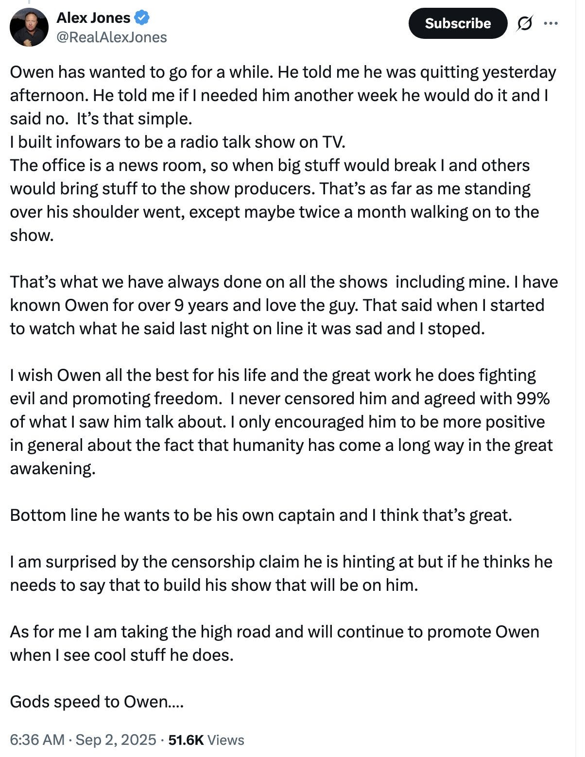 As of September 2, 2025, Infowars has not issued an official response. However, Shroyer has received an outpouring of support from his online followers. Shroyer’s departure marks a significant shift in the alternative media landscape, raising questions about Infowars’ future and the viability of independent ventures in a polarized digital space. As he prepares to launch WINN, Shroyer remains defiant, framing his exit as a stand for free speech and unfiltered truth. Whether *The Owen Report* can replicate or surpass his Infowars success remains to be seen, but for now, Shroyer’s bold move has captured the attention of supporters and skeptics alike.