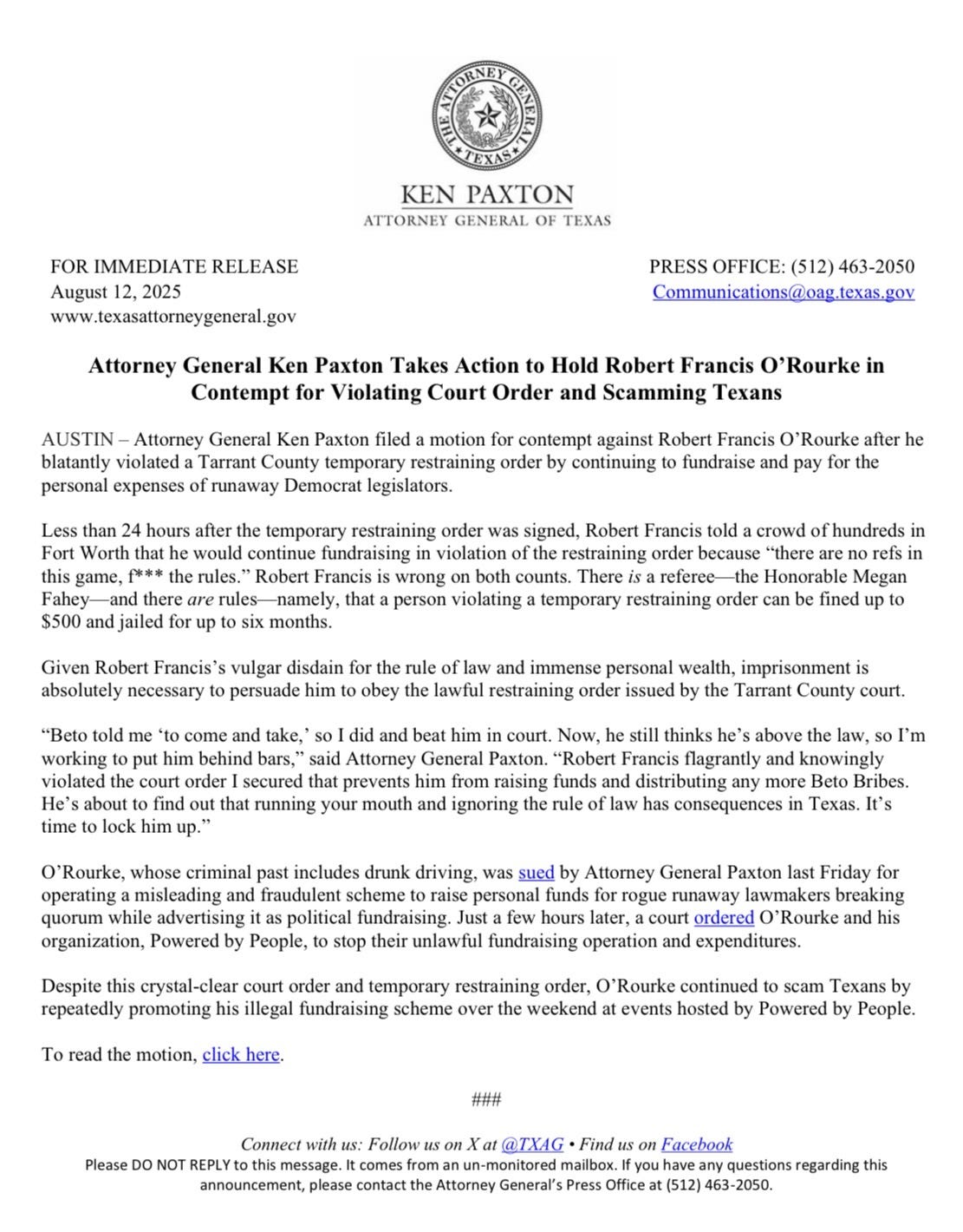 Texas AG Ken Paxton has filed a contempt motion against Robert Francis O'Rourke for violating a court order by fundraising and paying for personal expenses of runaway Democrat legislators. Less than 24 hours after a temporary restraining order, O'Rourke continued his actions, potentially facing a $500 fine and up to 6 months in jail. Paxton calls it a "misleading and fraudulent scheme."