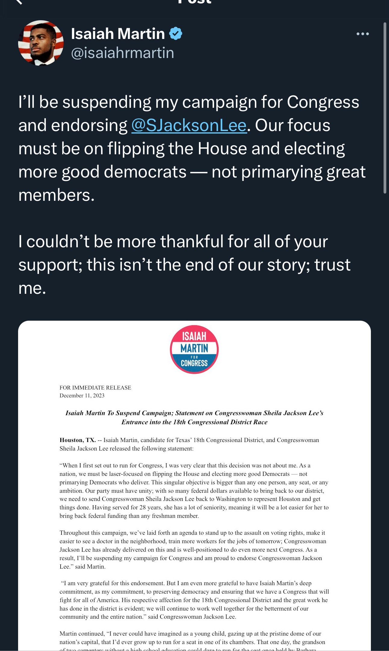 Following Lee’s announcement, DNC sock puppet Isiah Mitchell released a statement that he’d be suspending his campaign (after raising approximately $300k) to endorse Sheila Jackson Lee.