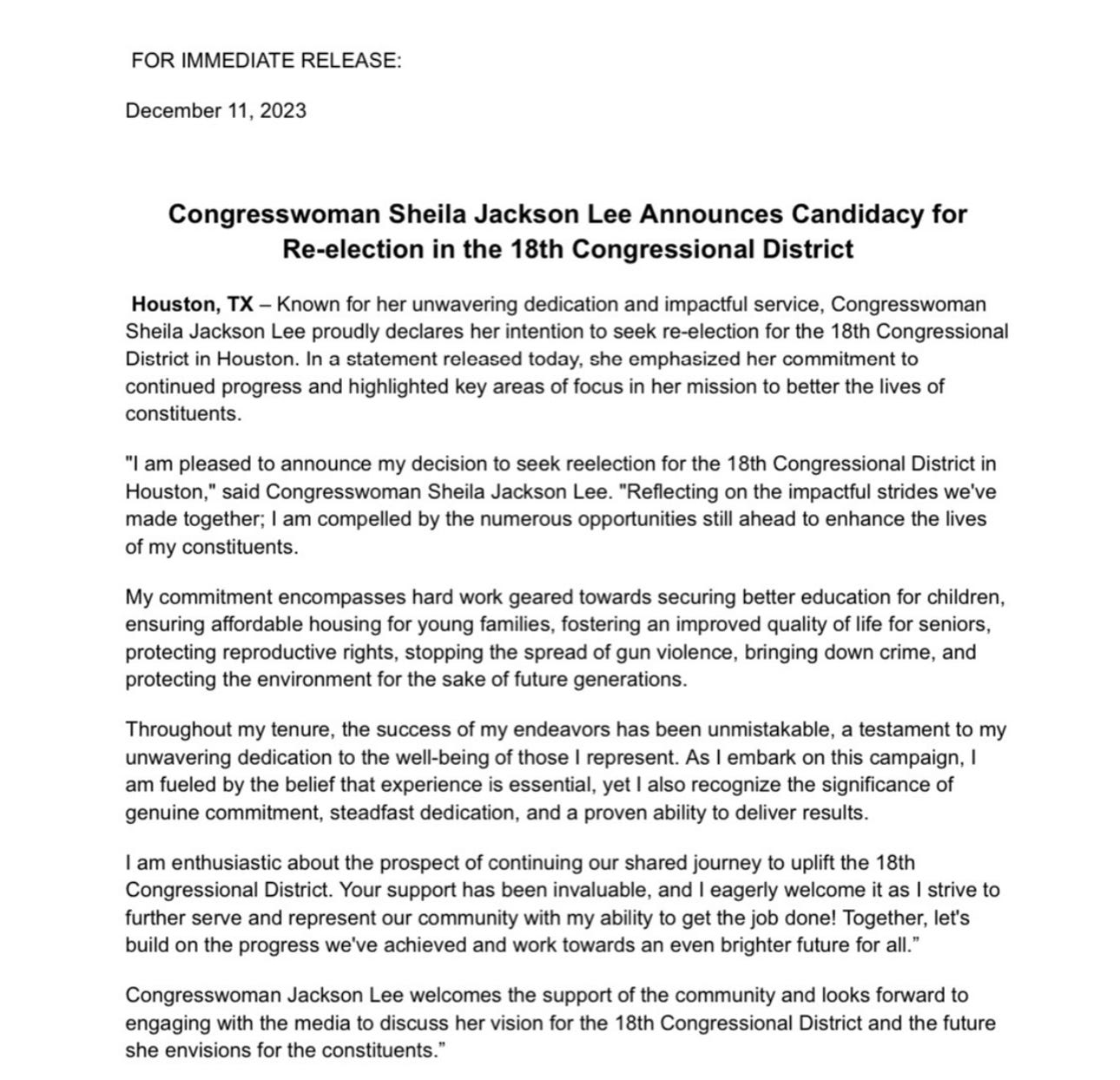 Jackson Lee announced her decision to run in a statement released Monday, saying she is “compelled by the numerous opportunities still ahead to enhance the lives of my constituents.”