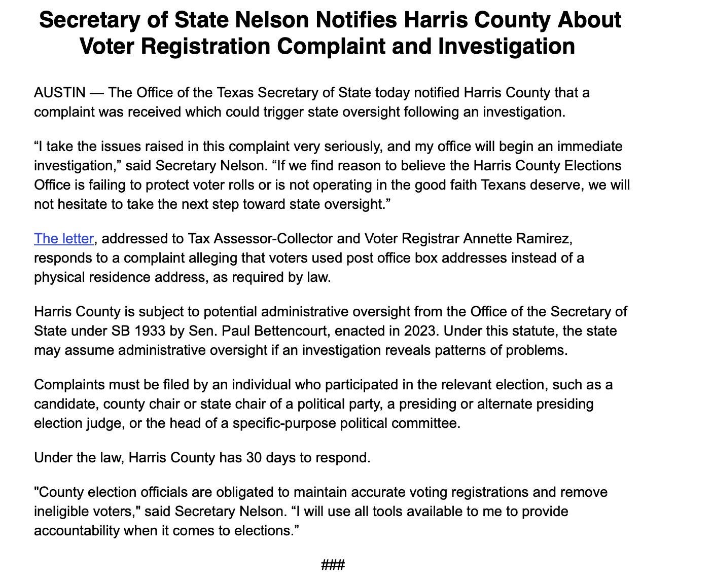 “I take the issues raised in this complaint very seriously, and my office will begin an immediate investigation,” Nelson said. “If we find reason to believe the Harris County Elections Office is failing to protect voter rolls or is not operating in the good faith Texans deserve, we will not hesitate to take the next step toward state oversight.”