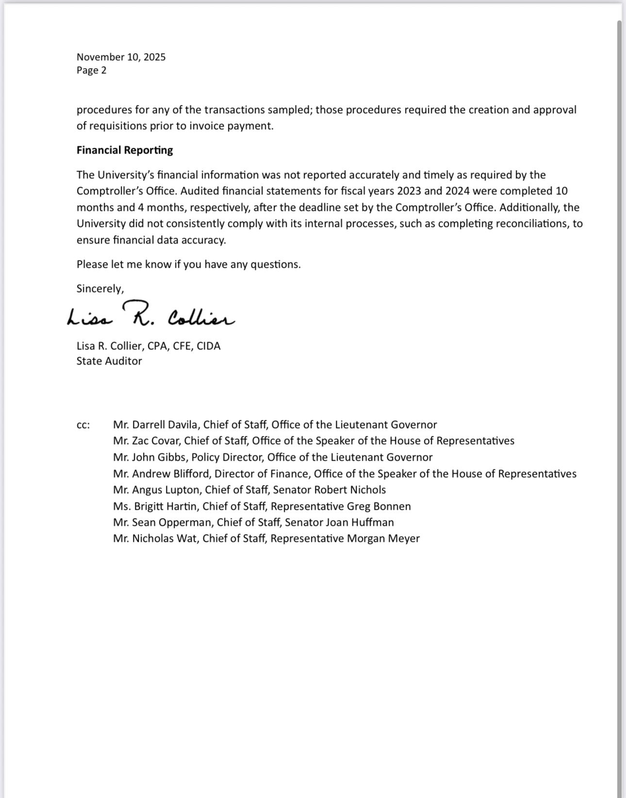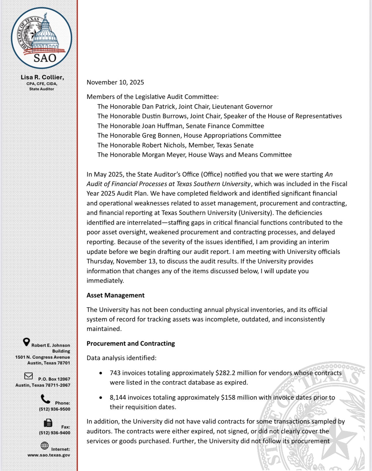 The State Auditor’s Office is drafting its full report. The interim letter was addressed to key legislative leaders, including: