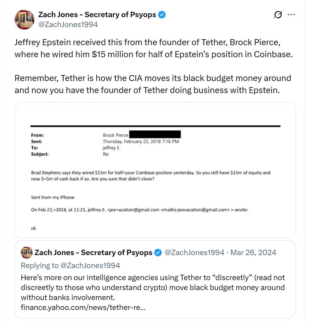 Additional claims have circulated, including a quoted post suggesting Epstein received $15 million from Pierce for half of his Coinbase position, framing Tether as a vehicle for moving "black budget" money. Such narratives tie into broader theories of intelligence agency involvement, though they remain unsubstantiated beyond personal connections.