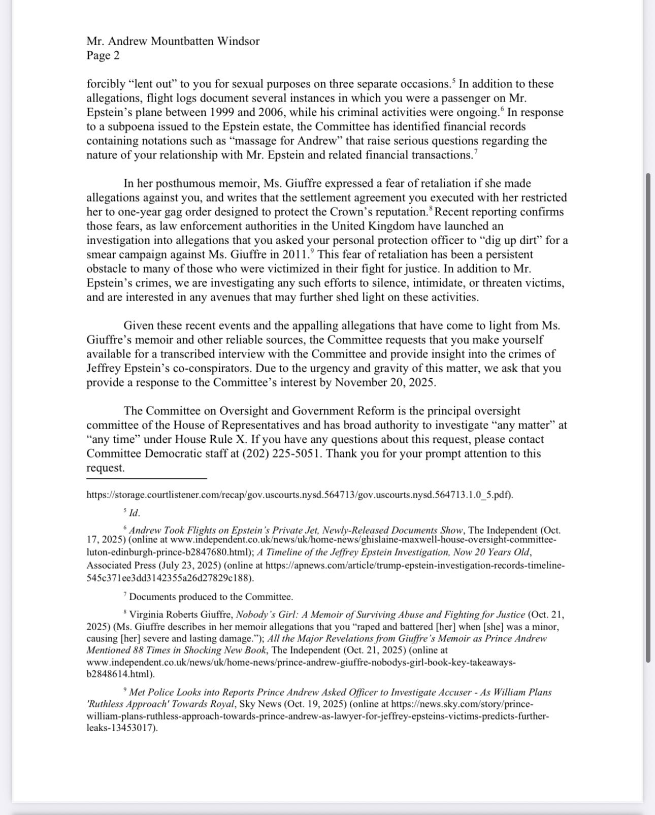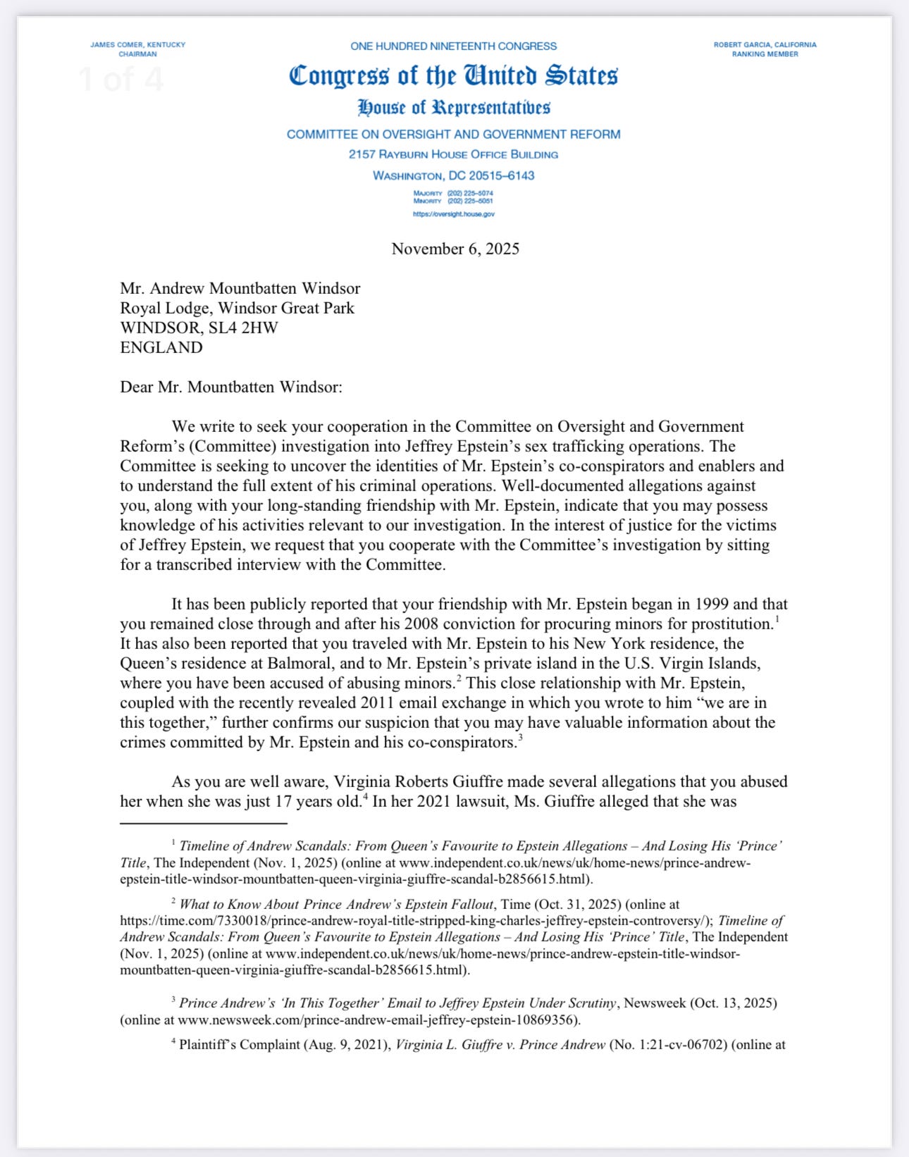 Democrats on the U.S. House Oversight and Accountability Committee have formally requested that Andrew Mountbatten Windsor, formerly known as Prince Andrew, appear for a voluntary interview as part of their investigation into the federal government’s handling of Jeffrey Epstein’s sex trafficking network.