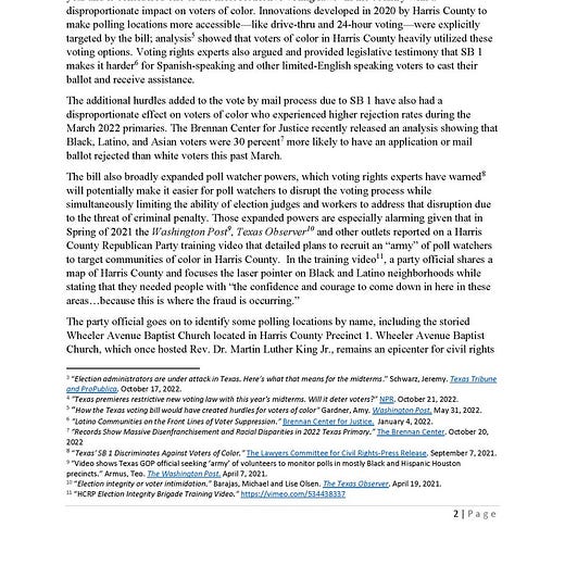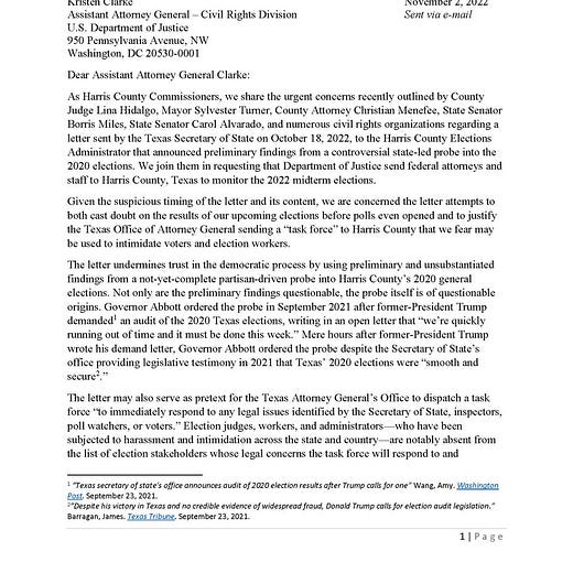 Harris County Democratic Precinct 1 Commissioner Rodney Ellis and Precinct 2 Commissioner Adrian Garcia are joining a push for federal election monitors at Harris County polling locations on the Election Day Nov. 8 over concerns of possible voter intimidation. Ellis and Garcia sent a joint letter Wednesday requesting that the U.S. Department of Justice send federal attorneys and staff to monitor election proceedings in the county. The request comes just weeks after Harris County Judge Lina Hidalgo, along with Harris County Attorney Christian Menefee and Houston Mayor Sylvester Turner made the same appeal. Noticeably missing from the letter was Lina Hidalgo….